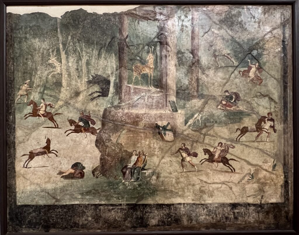 Tornando al MANN e tornando all’affresco, è interessante ciò che esso contiene di programmaticamente inattuale. La pittura pompeiana, e qui sta la sua superiorità assoluta come documento della storia della percezione umana, non è mai mimetica in senso banale. Essa è sempre, anche nei suoi esiti apparentemente decorativi, una teoria della visione. Quando i pittori delle domus vesuviane costruiscono lo spazio illusionistico di un bosco sacro, quando modulano la profondità attraverso il degradare cromatico dei verdi, quando fanno volteggiare i mantelli e vibrare i corpi nell’istante della caccia, non stanno copiando la realtà: stanno elaborando un sistema di equivalenze percettive che anticipa, con una disinvoltura che ancora oggi sgomenta, questioni che la pittura europea avrebbe ufficialmente aperto solo con l’Impressionismo.